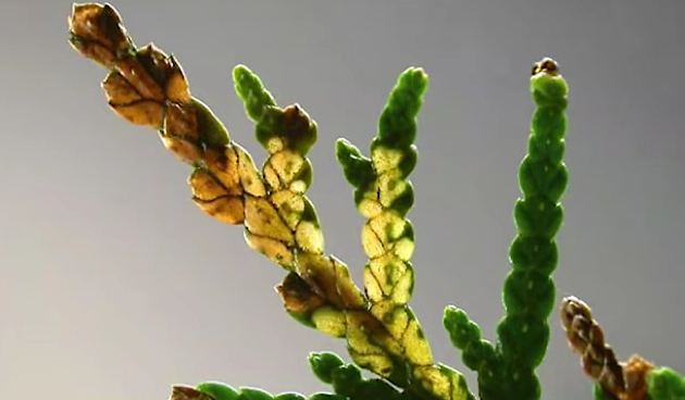 Шютте. Это болезнь характерна только для хвойных растений и поражает она, в том числе, и туи. Проявляется она обычно весной, когда становится тепло и гриб-патоген начинает активно разрастаться. У пораженных деревьев хвоя приобретает серо-коричневый цвет. А при сильном поражении туи становятся словно обугленными. Болезнь распространяется очень быстро и в короткие сроки может погубить все посадки.