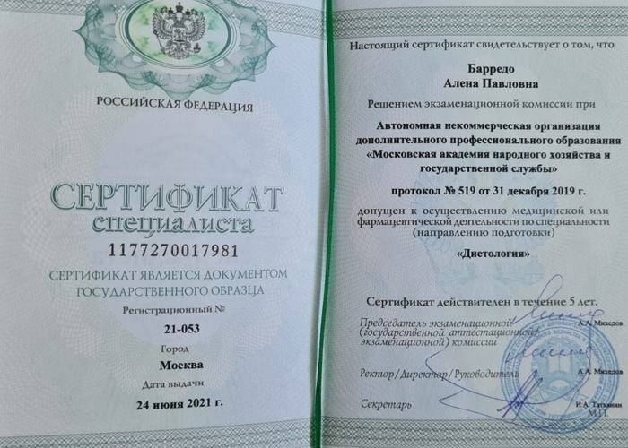 В 2021 году получила удостоверение о повышении квалификации по дополнительной профессиональной программе «Экспертная программа по функциональной интегративной диетологии».