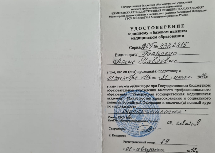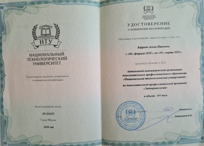 В 2016 году получила свидетельство о прохождении обучения, организованного Российской ассоциацией эндокринологов.