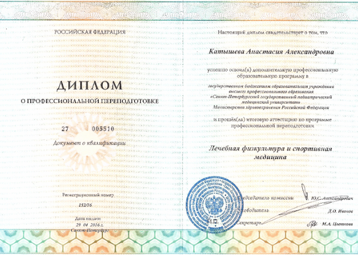 - 2016 г. — лечебная физкультура (Государственный педиатрический медицинский университет, г. СПб),