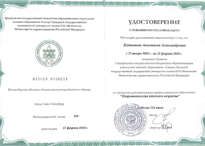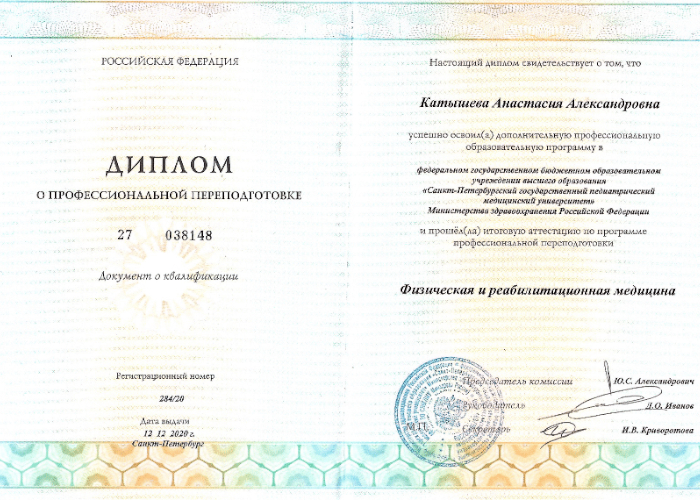 - 2019 г. — физическая и реабилитационная медицина (Государственный педиатрический медицинский университет, г. СПб),