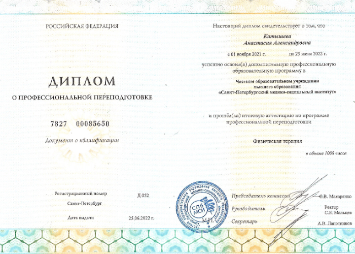 - 2022 г. — физическая терапия, сертифицированный специалист — Санкт-Петербургский медико-социальный институт.