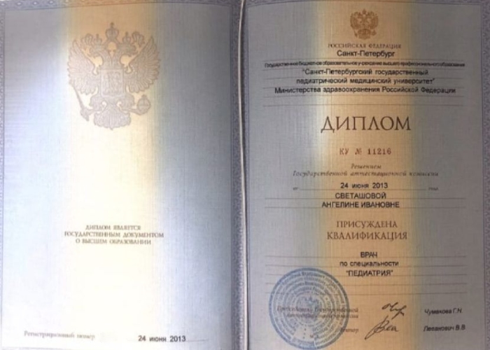 - Санкт-Петербургский государственный педиатрический медицинский университет (специальность «Педиатрия»);