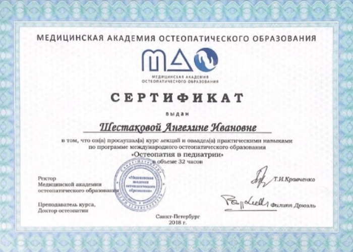 - Медицинская академия остеопатического образования (Краниальная и структуральная мануальная терапия; Принципы остеопатической диагностики и коррекции дисфункций скелетно-мышечной системы, внутренних органов и висцерального черепа);