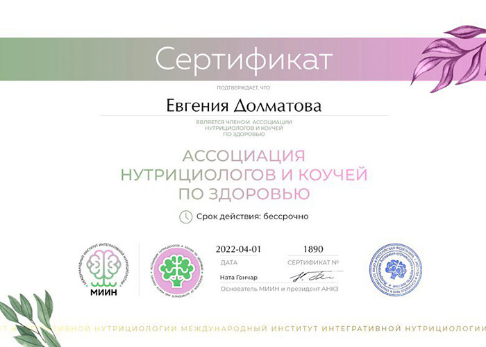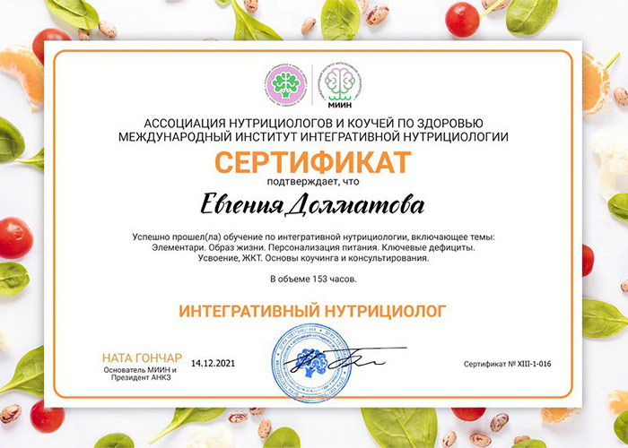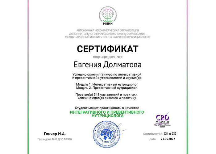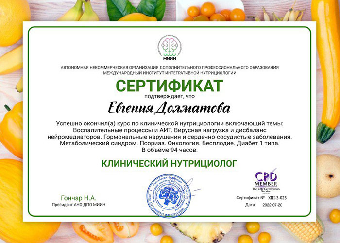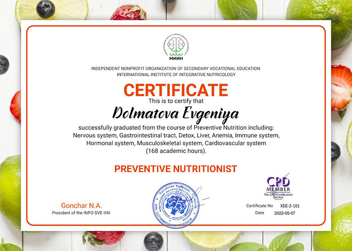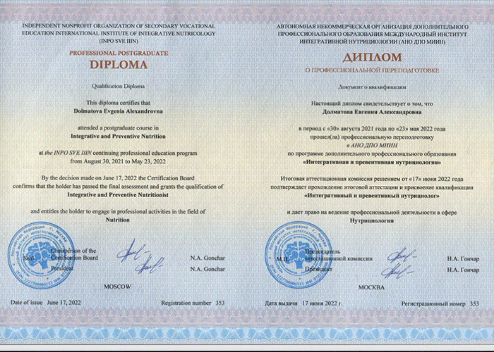- МИИН (Международный Институт Интегративной Нутрициологии), специальность Клинический Нутрициолог,