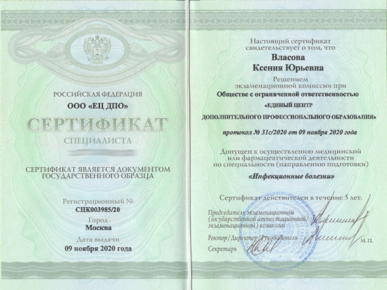 - 2020 год — Единый центр дополнительного профессионального образования. Повышение квалификации «Инфекционные болезни»;