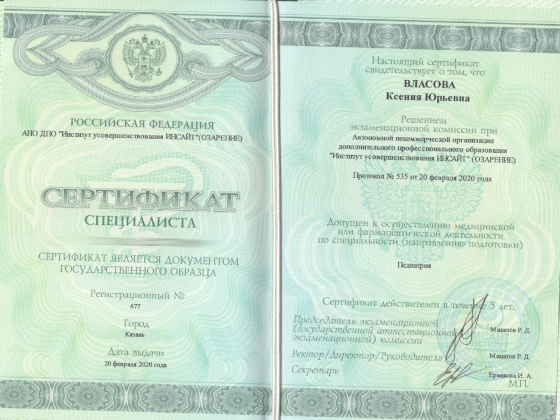 - 2020 год — Институт усовершенствования «Инсайт». Повышение квалификации «Педиатрия».
