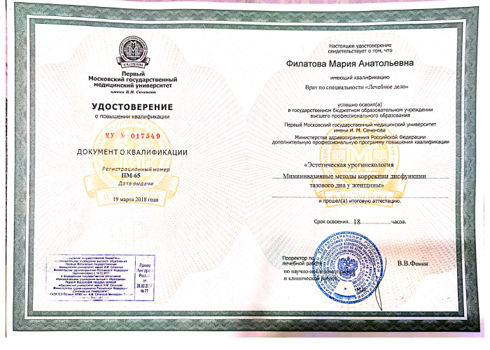 - Курс повышения квалификации «Перинеология: Эстетическая урогинекология Миниинвазивные методы коррекции дисфункции тазового дна у женщины», медицинский университет им. Сеченова, 2018 г.