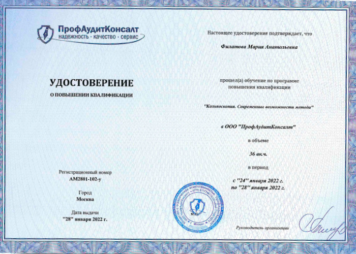 - Курс повышения квалификации «Кольпоскопия. Современные возможности метода», 2022 г.