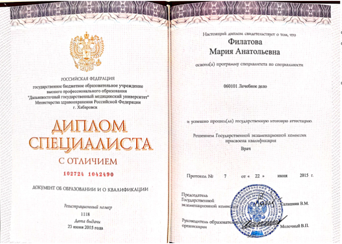 - Ординатура по специальности «Акушерство и гинекология» в 2017 г. Дальневосточный государственный медицинский университет, г. Хабаровск