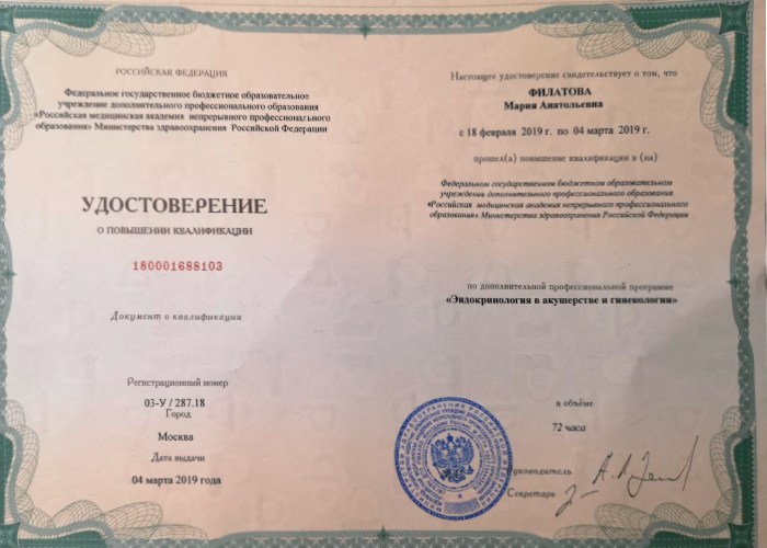 - Курс повышения квалификации «Эндокринология в акушерстве и гинекологии», Российская медицинская академия непрерывного медицинского образования, 2019 г.