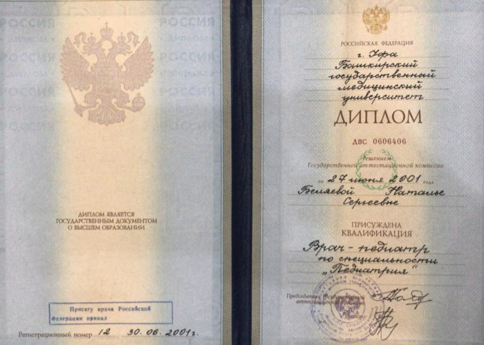 Удостоверение акушера-гинеколога, диплом по специальности «Педиатрия», сертификат по акушерству и гинекологии; курс «Эндокринные аспекты репродуктивного здоровья»