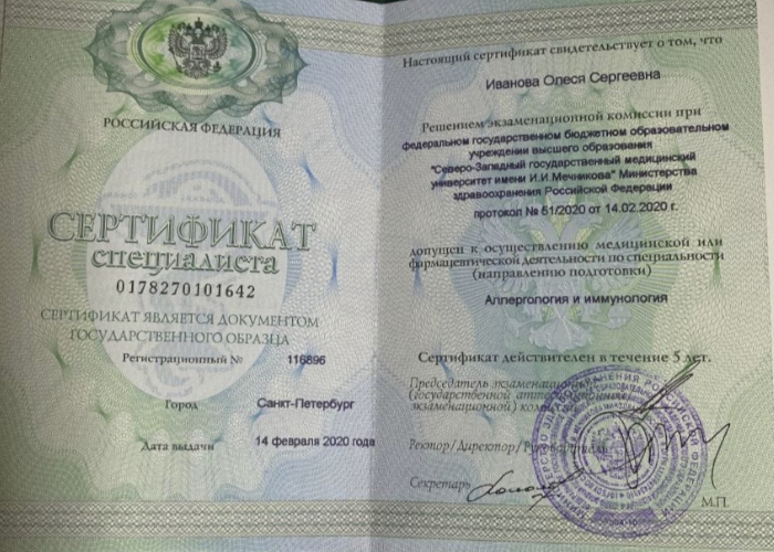 • Сертификат «Аллергология и иммунология»