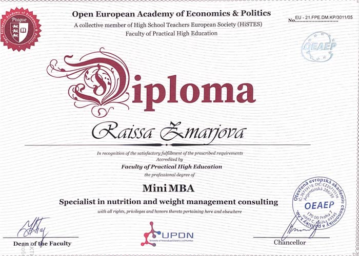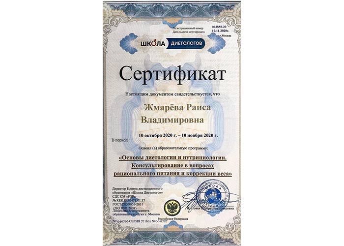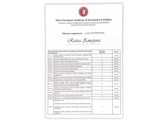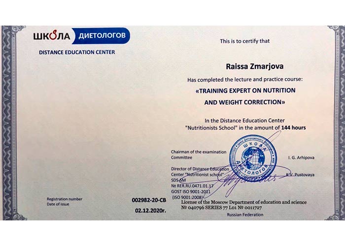 Действительный член сообщества Консультационного Диетологического Центра «Диетологи России», член Ассоциации Нутрициологов и Коучей по здоровью, член Эстонского сообщества специалистов по питанию ETNÜ, специалист по профессиональному сопровождению клиента до результата.