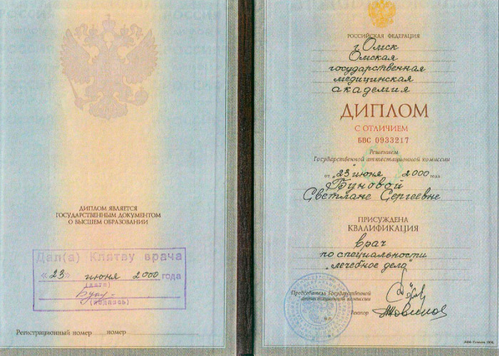 - 2000 г. - Омская государственная медицинская академия (лечебное дело). С отличием. Базовое образование.
