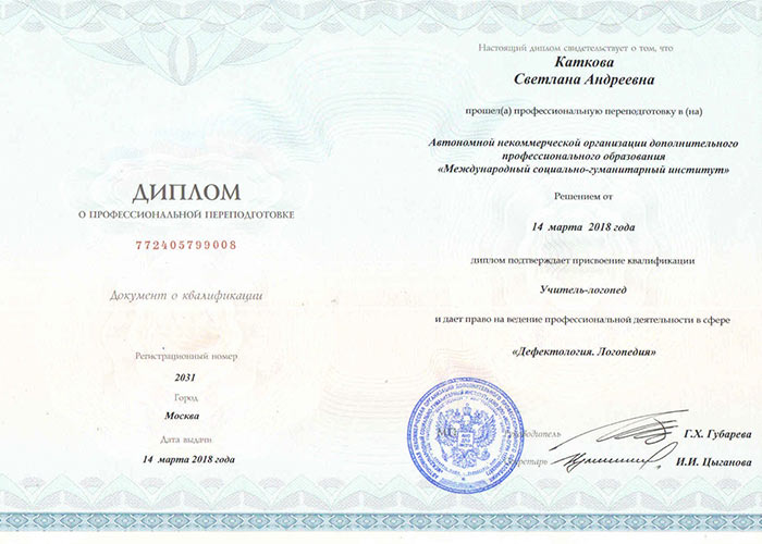 Работает в частном кабинете в Московской области, консультирует родителей, создает программы обучения и развития для детей, корректирует речь.
