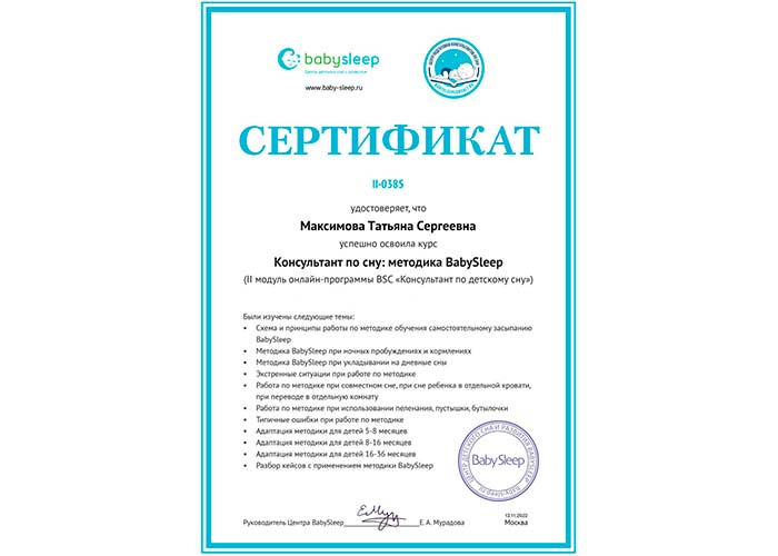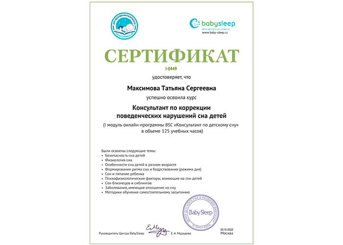 Сертификат: Консультант по коррекции поведенческих нарушений сна детей