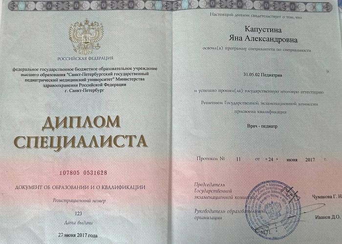 - 2017 г. — СПбГПМУ, специальность «Педиатрия»,