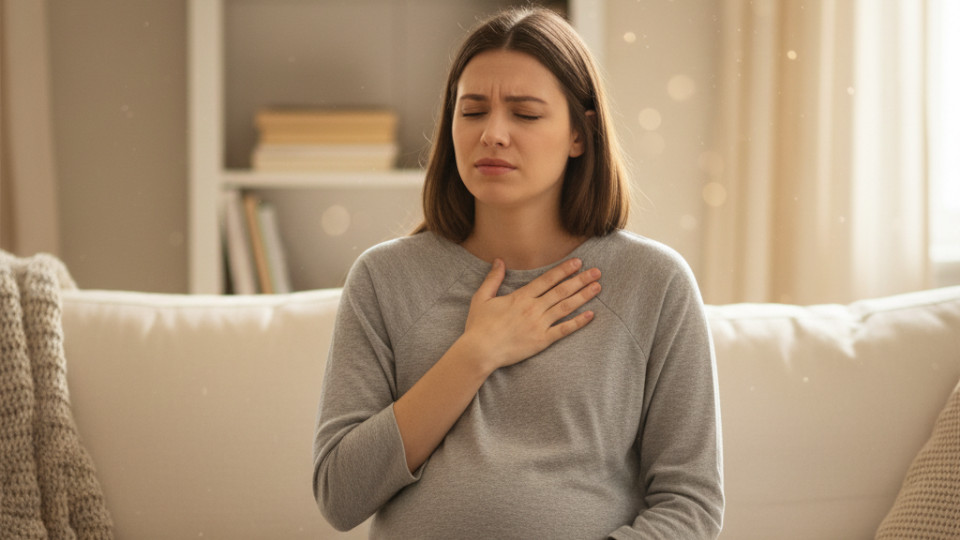 — Изжога — довольно распространенное явление при беременности. Ее основные симптомы: жжение за грудиной, кислый или горький привкус во рту, отрыжка, чувство «комка» в горле. Иногда присоединяются кашель, осиплость, першение, особенно в ночное время. Причина — попадание кислого содержимого желудка обратно в пищевод.