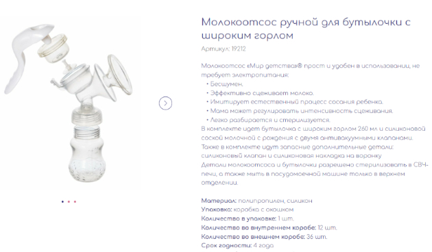 В комплект входит бутылочка на 160 мл, сам молокоотсос с клапаном и двумя запасными, соска размером SS для новорожденных. Устойчивость молокоотсоса обеспечивает специальная подставка.