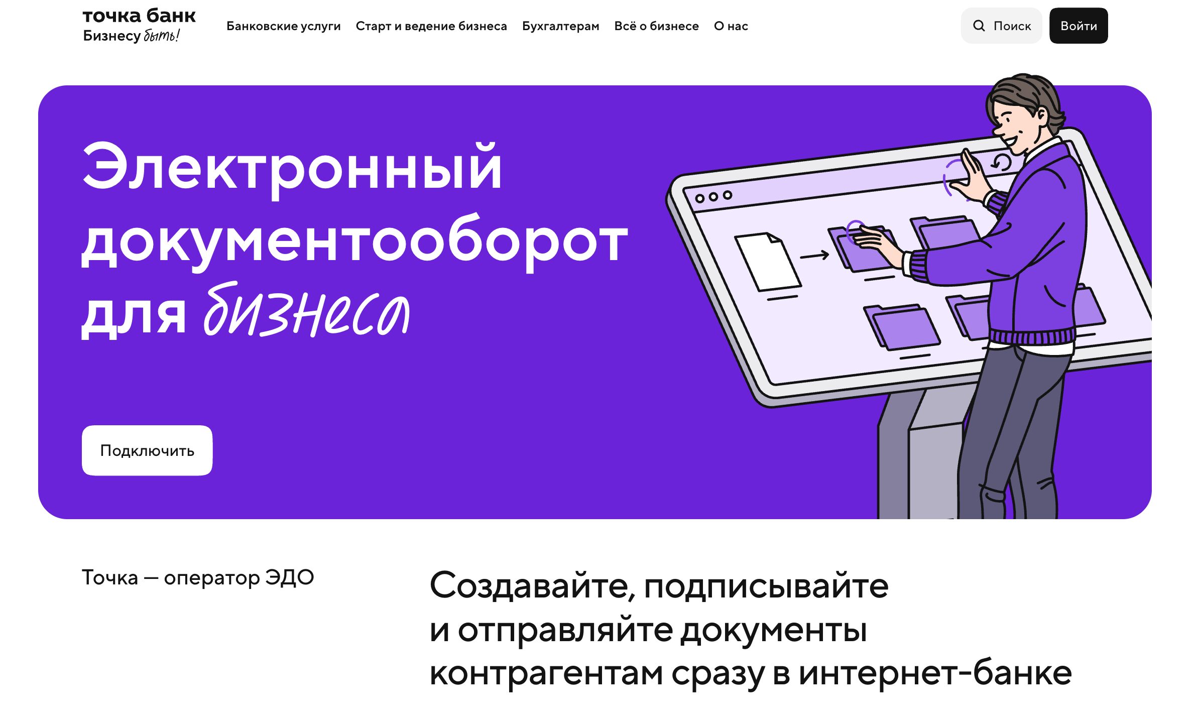 Известный онлайн-банк для малого бизнеса предлагает сервис электронного документооборота в своей экосистеме сервисов для развития бизнеса. ЭДО от «Точка Банк» позволяет создавать документы по готовым шаблонам и отправлять их контрагентам в другую систему ЭДО или на email. Сервис находится внутри интернет-банка — это позволяет собирать акт сверки на основе данных о платежах и закрывающих документов. Все задолженности контрагентов наглядно отображаются без таблиц в Excel. По оценке Frank RG, «Точка Банк» — лучший интернет-банк для малого бизнеса.