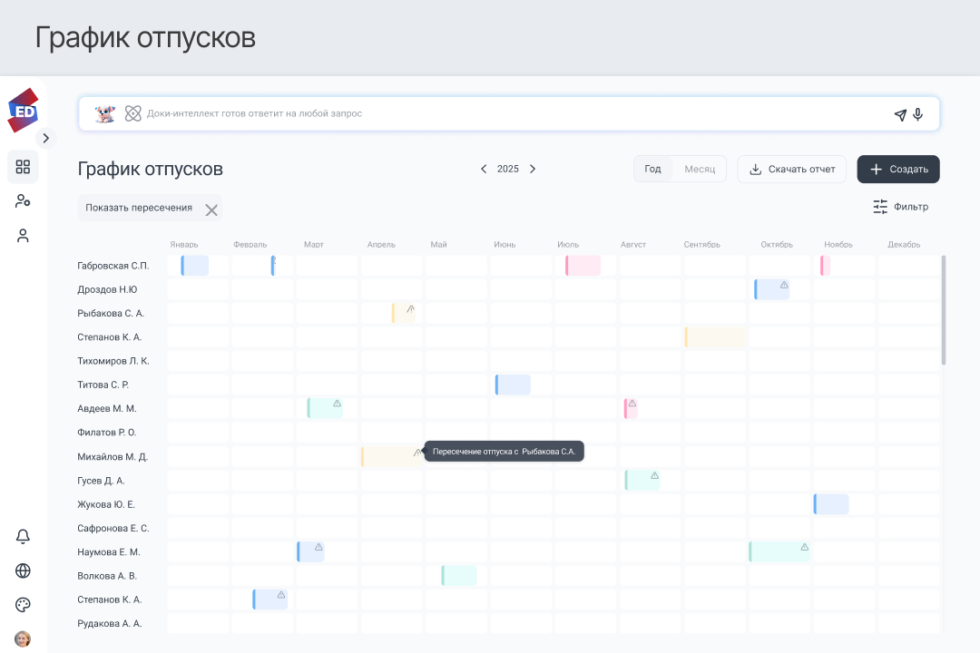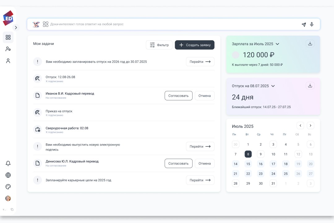 Еще одно преимущество системы — персональный ИИ-помощник «Доки», объединяющий различных ИИ-агентов, способных выполнять часть функций кадрового специалиста. ИИ-агентам можно передать рутинные задачи — создание заявок, оформление справок и больничных, ответы на обращения сотрудников. Например, когда лучше оформить отпуск, чтобы даты не пересекались с коллегами.