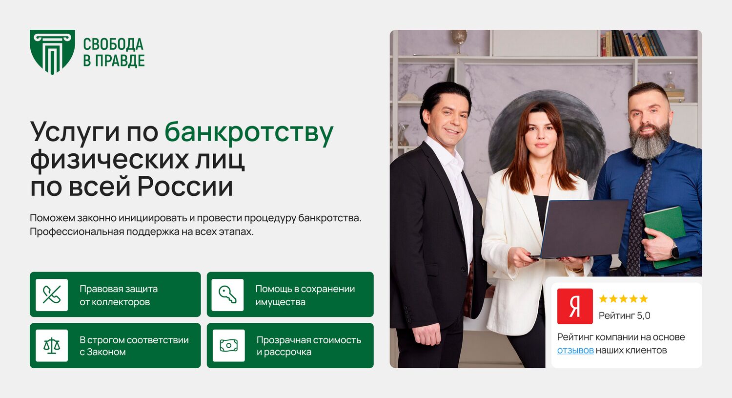 Юридическая компания, специализирующаяся на законном списании долгов физических лиц в Москве и других городах России. За годы работы успешно завершила более 11 тыс. дел. На рынке присутствует более 10 лет. Юристы помогают гражданам не только пройти процедуру банкротства, но и сохранить имущество, а также минимизировать финансовые потери. Общая сумма списанных долгов к настоящему моменту превышает 7,5 млрд рублей. Гарантия положительного результата фиксируется в договоре.