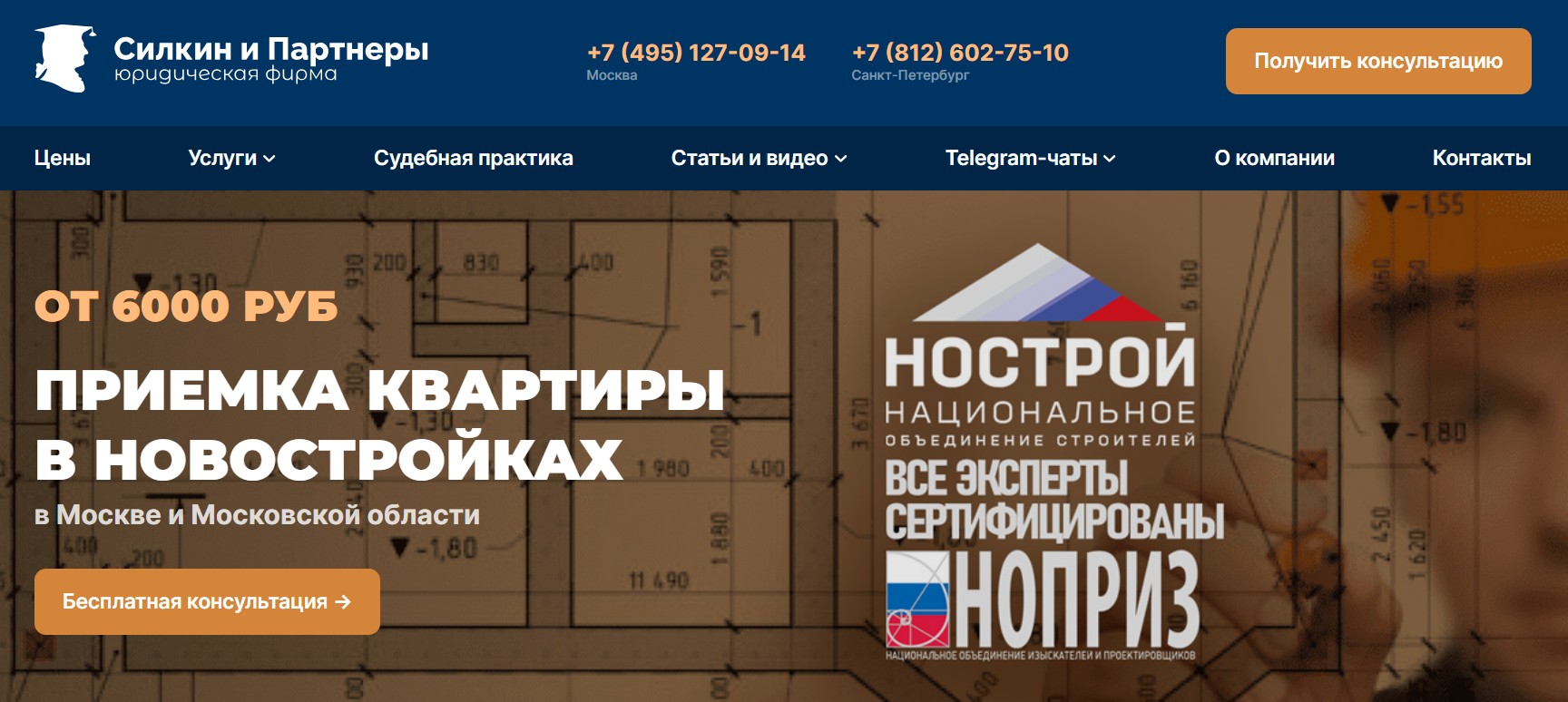 Юридическая компания с более чем 20-летним практическим опытом. Оказывает широкий спектр услуг, в том числе занимается приемкой квартир в Москве и Санкт-Петербурге. Благодаря помощи «Силкин и Партнеры», покупатели квартир могут избежать неприятных сюрпризов и потенциальных проблем в будущем. Профессионалы выявят все скрытые недостатки, проверят соответствие реального состояния квартиры условиям, которые указаны в контракте или договоре. Компания работает без предоплаты при заключении договора и даже компенсирует расходы на нотариальную доверенность.