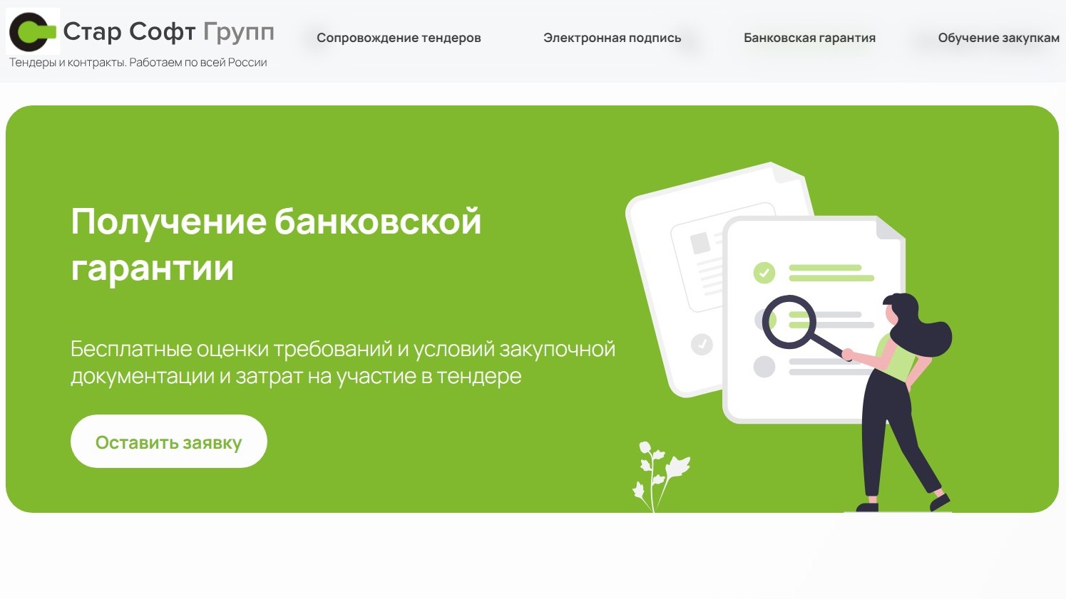 «Стар Софт Групп» специализируется на комплексном тендерном сопровождении бизнеса — от оформления электронной подписи и поиска выгодной сделки, до подачи заявки на конкурс и подписания контракта. К основным услугам относится и помощь с получением банковской гарантии для обеспечения контрактов по 44-ФЗ, 223-ФЗ, 185-ФЗ. В списке партнеров — 20 банков, аккредитованных Минфином и готовых рассмотреть заявку в течение 1-2 дней после подачи документов.