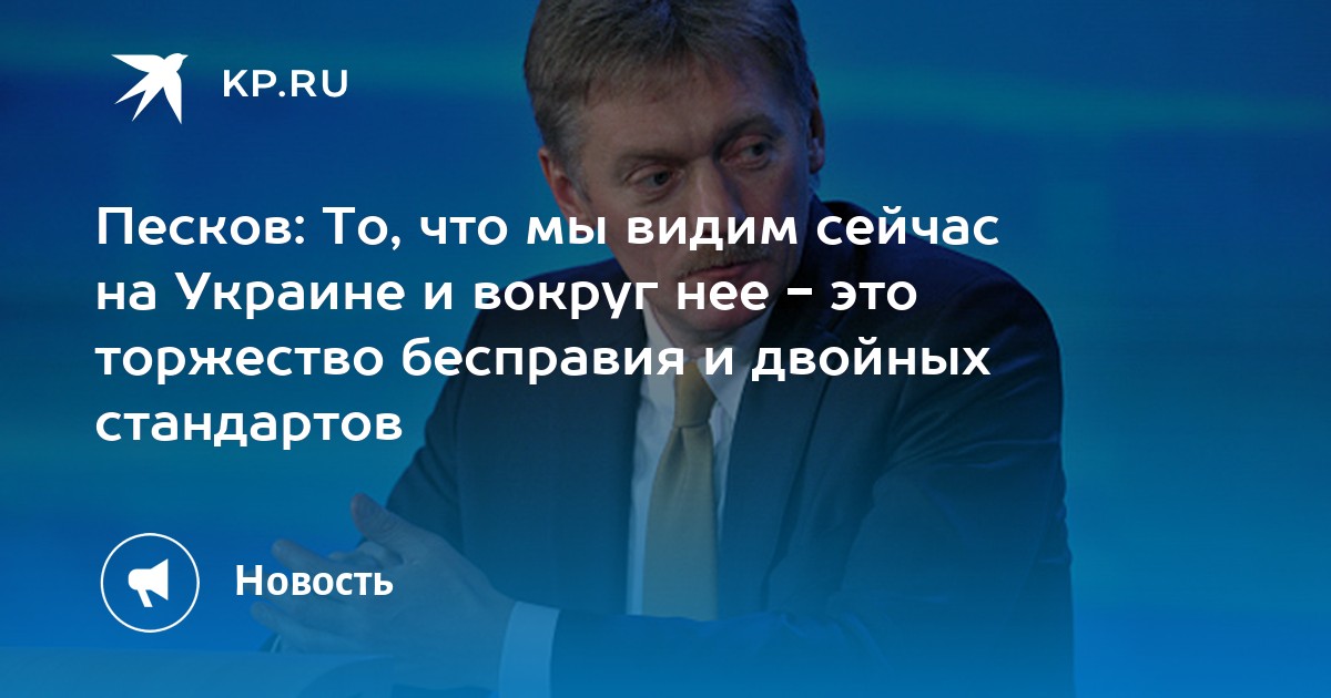 - В целом то, что мы видим сейчас на Украине и вокруг нее, - это такое торжество бесправия, торжество цинизма и торжество коллапса международного права, торжество двойных стандартов, - сказал Песков в интервью программе "Воскресный вечер с Владимиром Соловьевым", фрагмент которого показал телеканал "Россия-24". Также Дмитрий Песков отметил, что "наши западные партнеры признали легитимными тех, кто называет сейчас себя руководителями Украины, несмотря на то, что эти люди пришли при поддержке тех людей, которые устроили силовой переворот". Отдельно руководитель пресс-службы президента остановился на теме роли России в событиях на Украине. Все произошедшее Песков назвал исключительно "внутриукраинскими процессами".