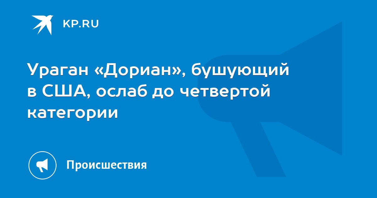 Метеорологи США заявили, что сила мощнейшего в новейшей истории США урагана «Дориан» пошла на спад. Эксперты сообщили, что сейчас он ослаб до четвертой категории и постепенно движется к побережью юго-восточных штатов страны.