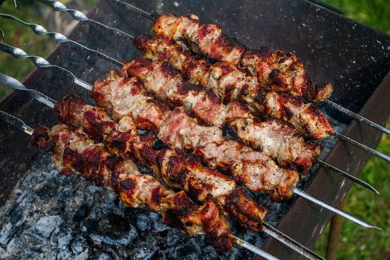 Мясо нужно нанизывают на шампуры по 4–5 кусков, чередуя с луком, и жарят на хорошо прогоревших углях без открытого пламени. Время приготовления составляет около 15–20 минут — до появления румяной корочки со всех сторон.