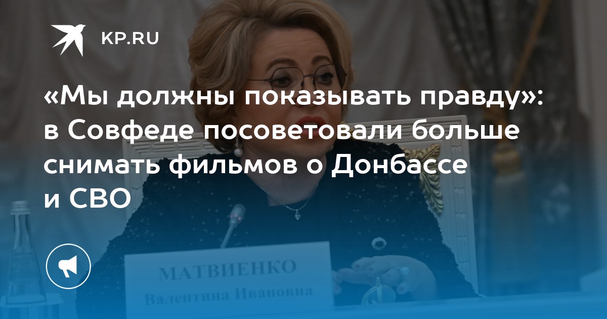 Правда о Донбассе должна быть зафиксирована через фильмы и творческие проекты для широкого показа. Об этом рассказала председатель Совфеда Валентина Матвиенко на пленарном заседании палаты.