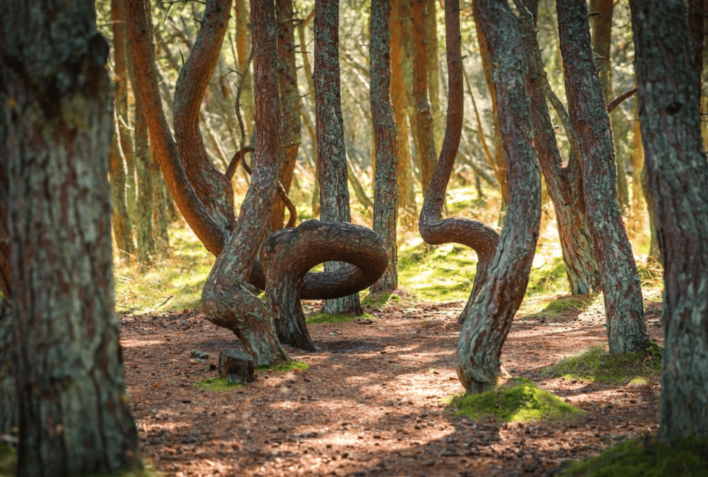 На 37-м километре Куршской косы находится уникальная природная зона — «танцующий» хвойный лес с причудливо изогнутыми соснами. Он был посажен в начале шестидесятых для укрепления песков дюны Круглая. Что именно заставляет деревья «танцевать», доподлинно неизвестно. Одни считают, что дело в геомагнитных полях, другие обвиняют сильный ветер, дующий в нескольких направлениях. Среди причин называют и гусениц бабочки побеговьюн, поедающих почки молодых сосен, что приводит к деформации стволов. Что бы это ни было, в «танцующем лесу» очень интересно.