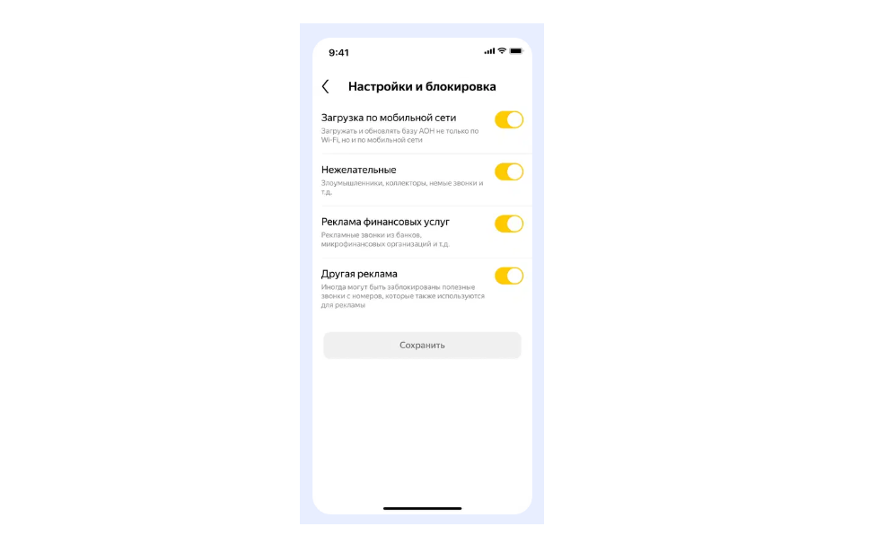 Помимо возможности бесплатно скачать определитель номера Яндекс на Андроид или айфон, есть возможность персонализированно настроить его работу до мельчайших деталей. Например, можно выбрать не только какие типы вызовов нужно блокировать, но и как это делать: отклонять или заглушать, получать уведомление о блокировке входящего вызова или нет. Также утилита позволяет добавлять отдельные контакты в черный список и при необходимости разблокировать их.