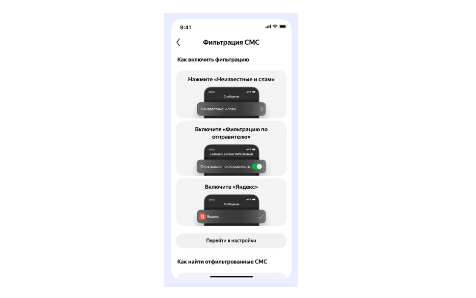 Также можно включить фильтрацию спамных СМС. Для этого нужно в настройках айфона выбрать Сообщения → Неизвестные и спам → Фильтрация по отправителю → Яндекс.