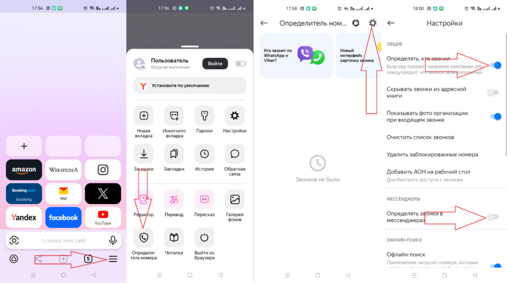 Чтобы включить утилиту через Яндекс Браузер, нужно нажать в нем на три черты, выбрать «Определитель номера» и тапнуть «Включить». Вы попадете в тот же самый интерфейс утилиты и сможете в настройках активировать определение того, кто звонил, и звонков в мессенджерах.