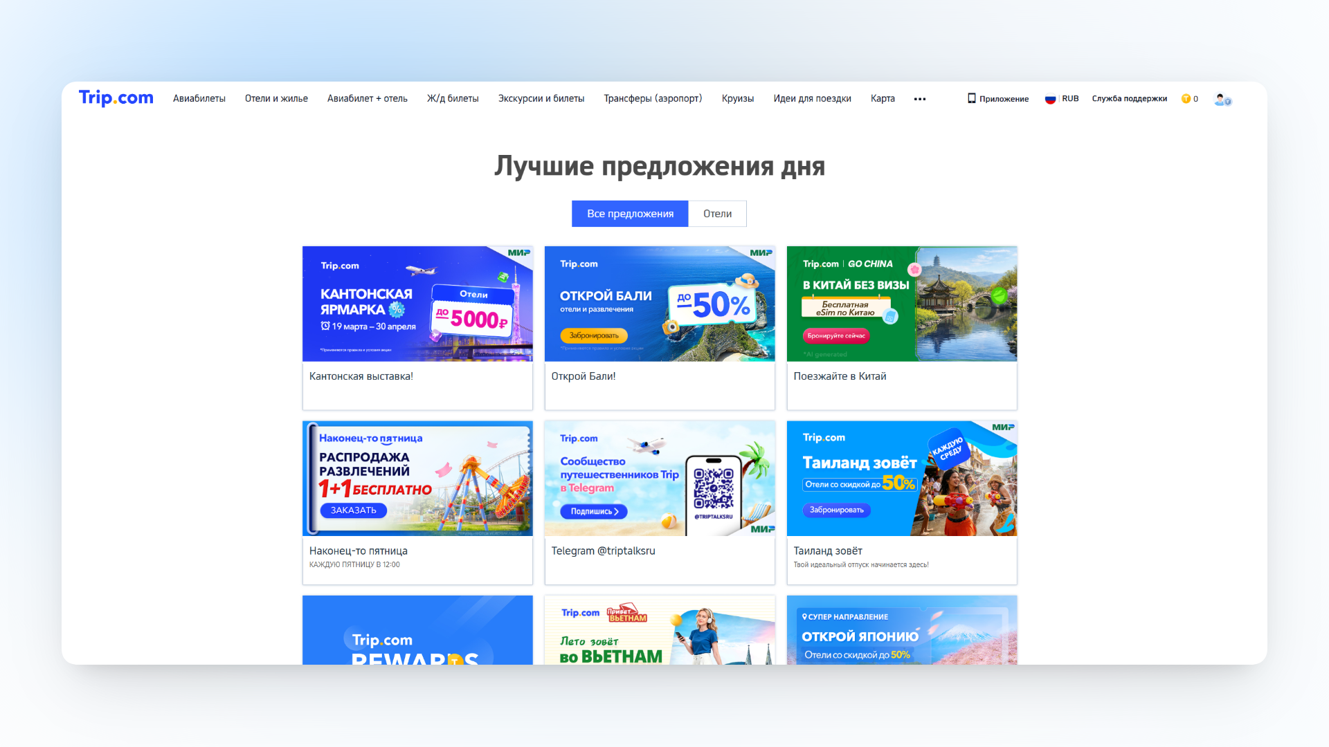 Trip.com — международный сервис бронирования путешествий с русскоязычным интерфейсом и поддержкой оплаты картами МИР. На платформе доступны авиабилеты на рейсы более 800 авиакомпаний, свыше 1,4 миллиона отелей по всему миру, железнодорожные билеты по Китаю, Европе и Азии, трансферы из аэропортов, аренда автомобилей, входные билеты на достопримечательности и круизы.