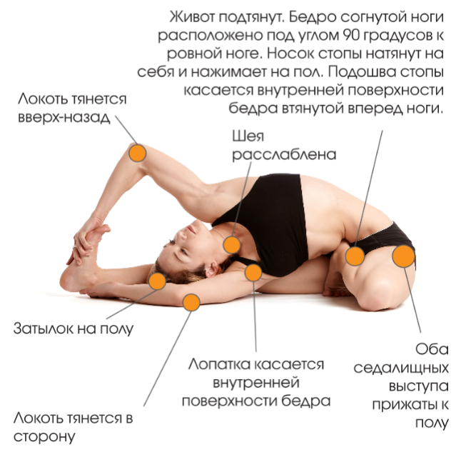 Важно! Нельзя тянуть рукой стопу на себя, не раскрывая тазобедренный сустав. Это может привести к травме коленного сустава. Следите за тем, чтобы после выполнения наклона и поворота туловище плотно прилегал к ноге, а таз с двух сторон плотно прилегал к полу. Тяните стопу вытянутой вперед ноги носком на себя так, чтобы внешнее ребро стопы не поворачивалось вовнутрь.