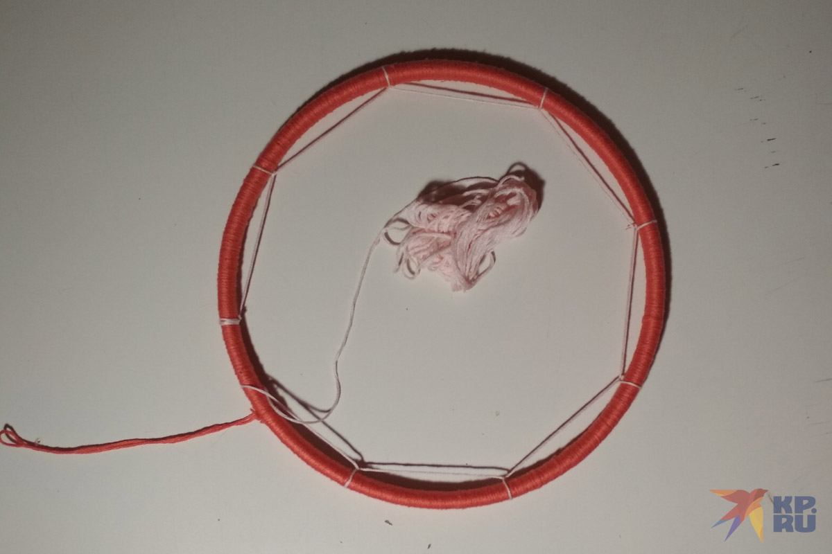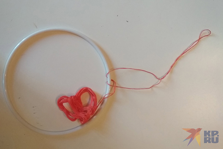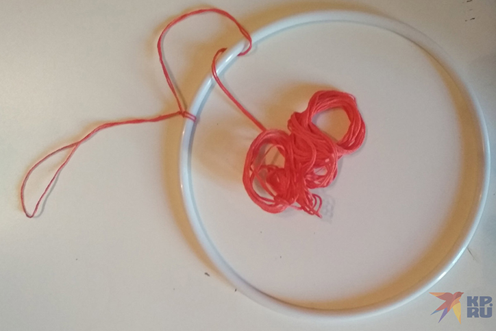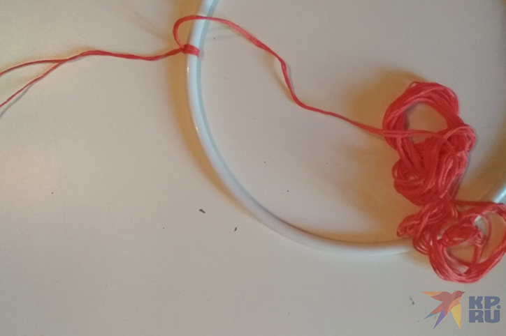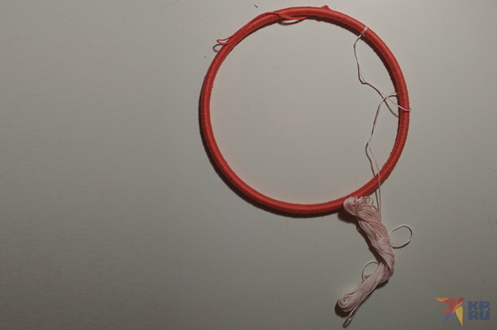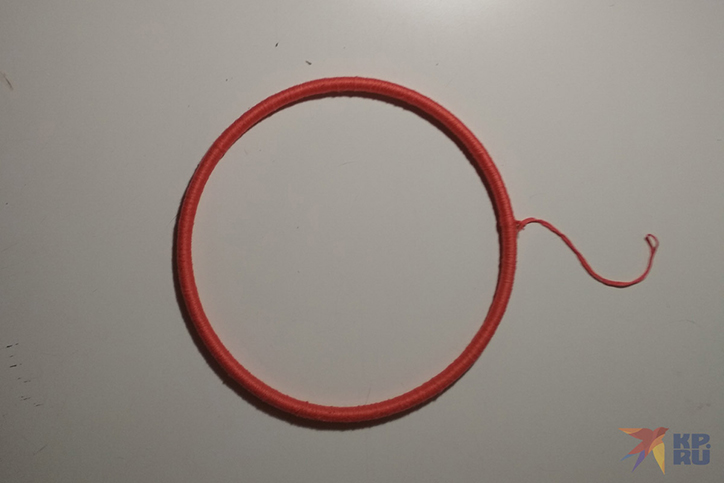 В нашем случае основой для ловца снов станут пяльцы, а точнее, их внутренняя часть. Берем нить, завязываем на конце петельку, за которую мы будем подвешивать наш амулет, а затем плотно обматываем нитью основу так, чтобы ее полностью спрятать. Каждый новый виток должен плотно прилегать к предыдущему. Конец нитки закрепляем узелком и отрезаем лишнее.