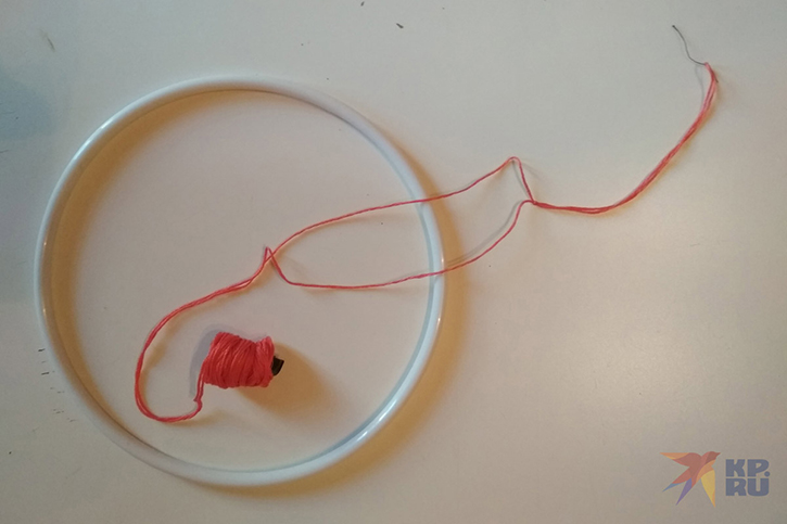 Пяльцы обычно гладкие, а значит, мы можем использовать и другой способ. Для него нам понадобится длинная, сложенная вдвое нить. На стороне сгиба делаем петельку для подвешивания. Начиная с другого конца, сматываем нить в клубок для удобства. Закрепляем ее на пяльцах: кладем нить сверху, проводим под пяльцами и выводим в центре между двух нитей, получая узелок.