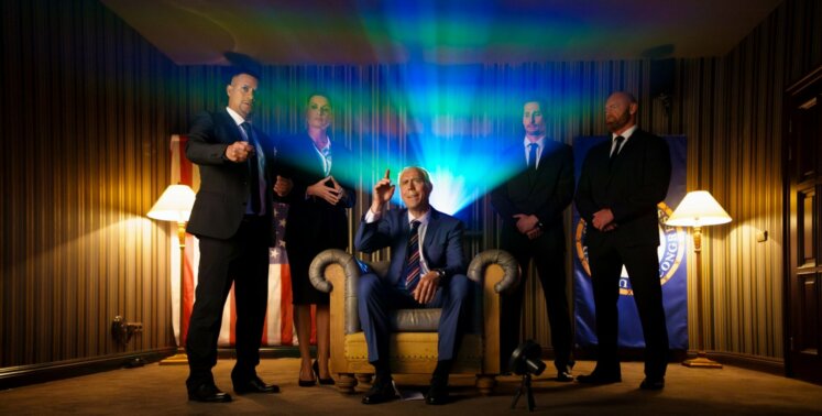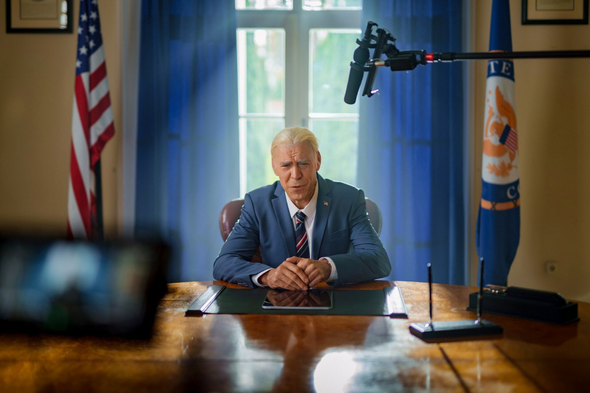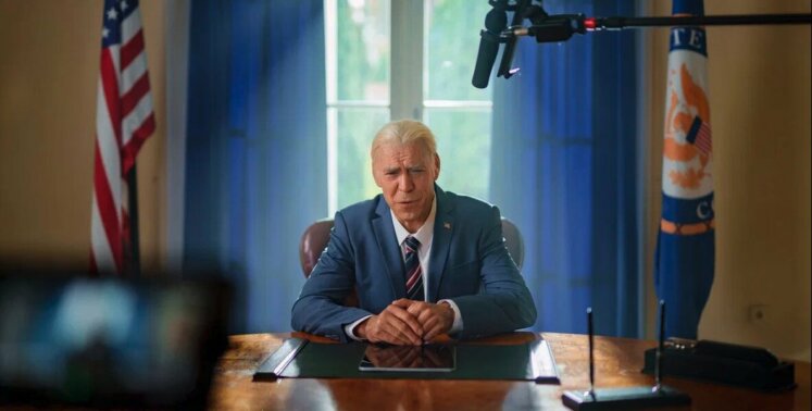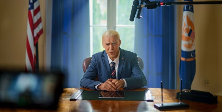 - Роль американского президента Джо Байдена сыграл актер Дмитрий Дюжев. Для перевоплощения он из брюнета превратился в седого сгорбленного дедушку с белоснежными накладными зубами.