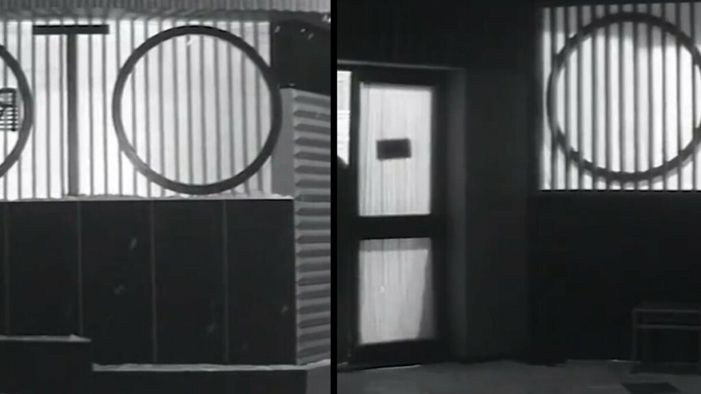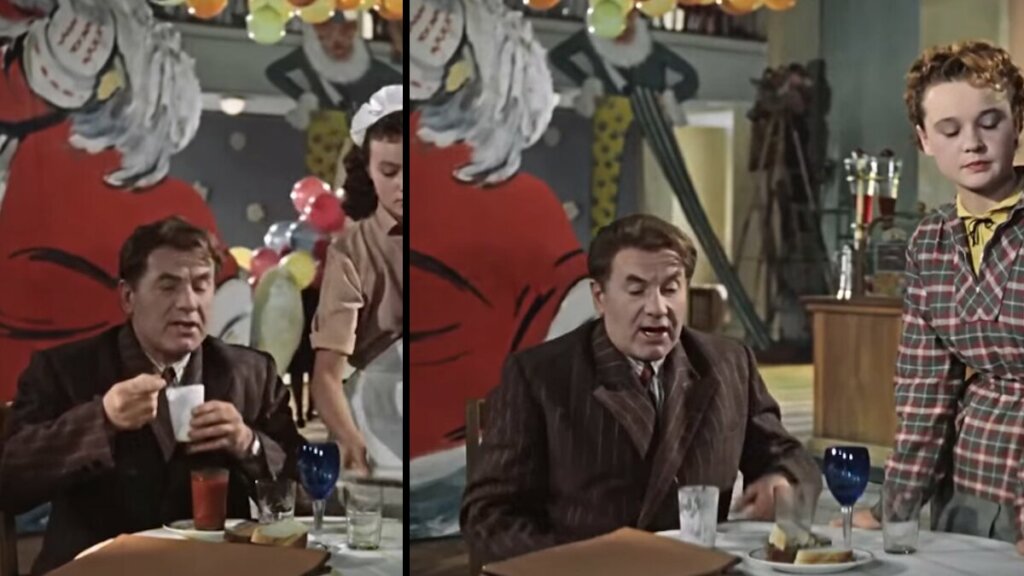 В самом начале фильма идут бурные обсуждения о том, как выполнить и перевыполнить план. Но, кажется, общий кадр и крупный план снимались в разное время, и режиссер не заметил, что задний фон немного отличается.