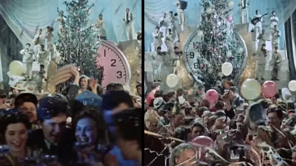 Новогодняя елка, которая была украшена только «дождиком», к концу легендарной песни про пять минут уже стояла украшенная огромными разноцветными шарами. Скрипачи, кстати, тоже вернулись на своё место.