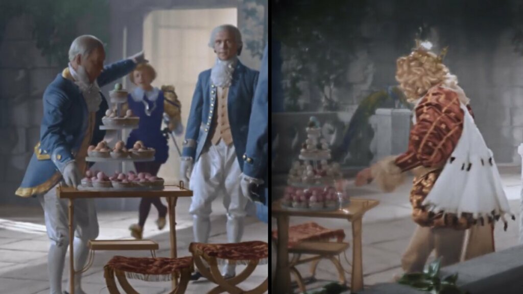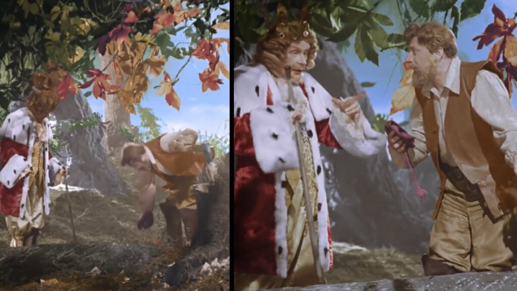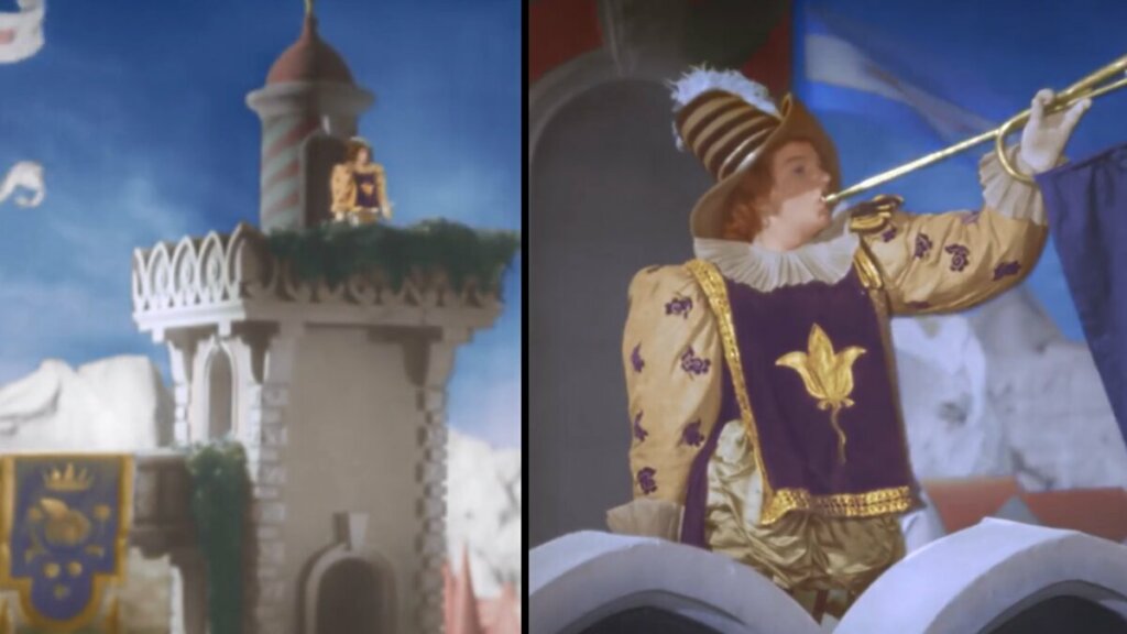 В самом начале сказки, когда королевский герольд объявляет о подготовке к балу, на общем плане видно, что около его балкона пышная растительность. Которая куда-то делась на крупном плане.