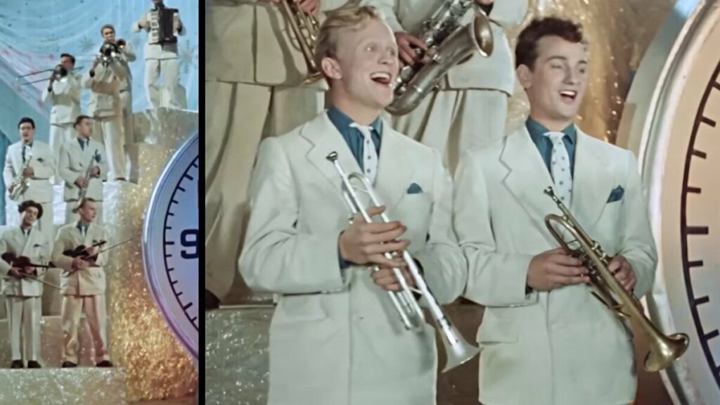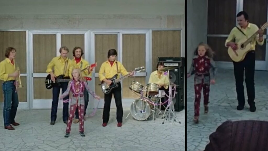 Кстати, сам номер со «Снежинкой» тоже был наполнен волшебством. Ансамбль «Помарин» изначально состоял из пяти музыкантов: трое играли на электрогитарах, один на трубе и один — на барабанах. Но к концу номера появляется еще один участник, аккомпанирующий на акустической гитаре.
