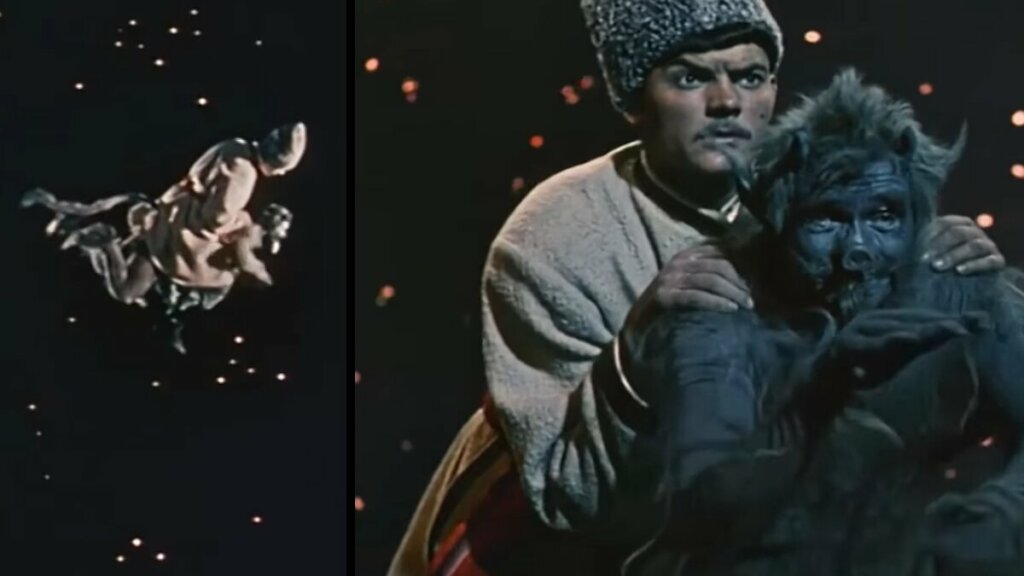 Все полеты Георгий Францевич Милляр выполнял сам. Это было непросто: на фоне черного неба из бархата на черном канате актеров подвешивали, имитируя полет. Но если присмотреться, Вакула верхом на черте по-разному на нем сидит: при общем плане он сидит у него на пояснице, как на лошади, а при крупном плане — герой сидит как бы за спиной и держится за плечи беса.
