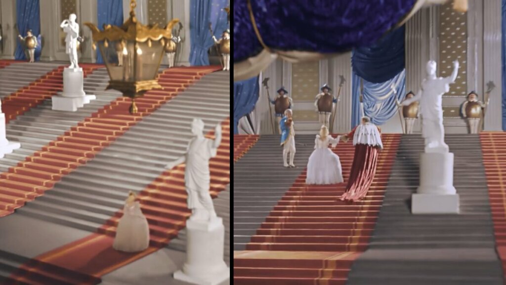 Король встречает Золушку, которая поднимается по одной ковровой дорожке. Потом они там же присели, чтобы девушка зашила воротник Королю. И тут же они начали подниматься по ступенькам вверх, но, судя по статуям, уже по другой дорожке.