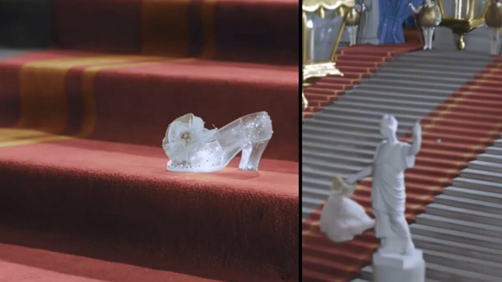 Кстати, хрустальная туфелька на общем плане была заметно дальше от края дорожки, чем когда ее показали крупным планом — видно полоски края ковра.