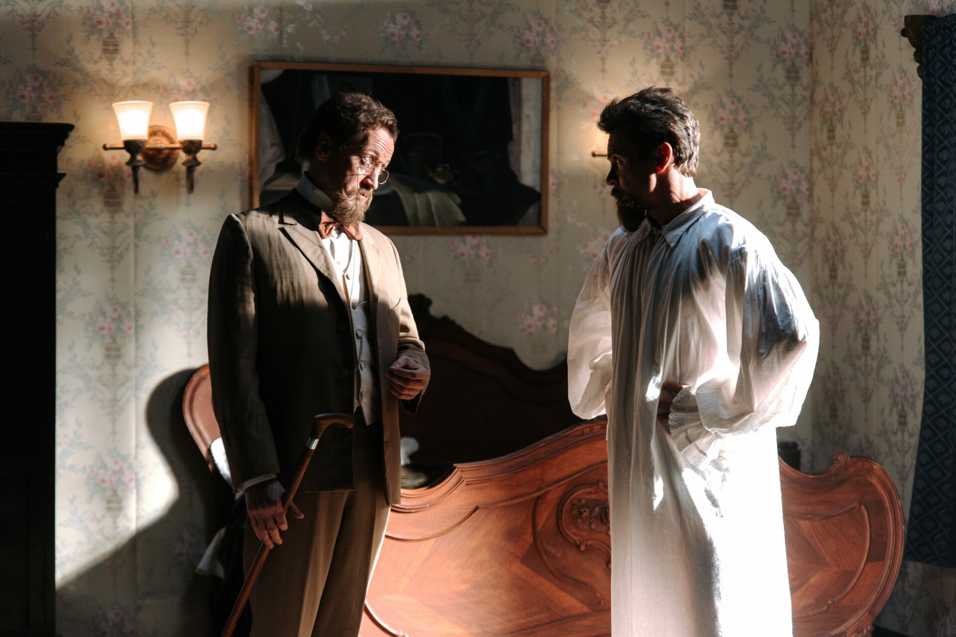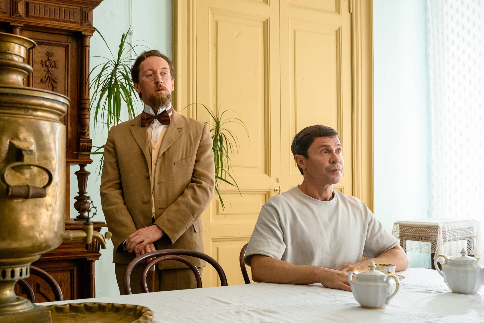 - Большое внимание уделили деталям: актеры, изображающие Чехова, носят его «фирменную бородку», винтажный костюм, антикварное пенсне, серебряные часы 1895 года и аналог трости Чехова, которую Антон Павлович использовал в жизни. Художники потрудились над видом фонендоскопа, намекая о первой профессии писателя.